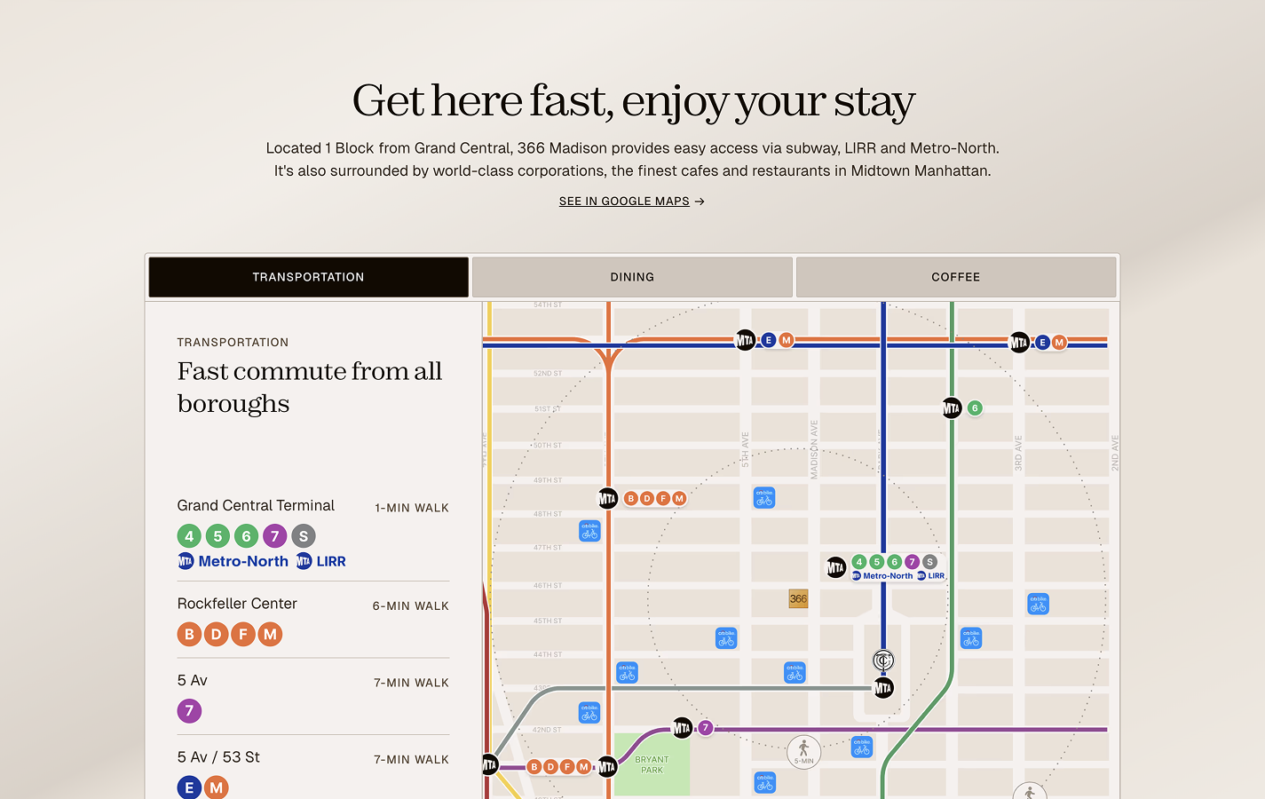 After an ownership change and redevelopment, this website was created to highlight 366 Madison's proximity to Grand Central, unique design, and high-end finishes. The website's visual direction matches the architecture, with its unique lighting strips and curved elements.