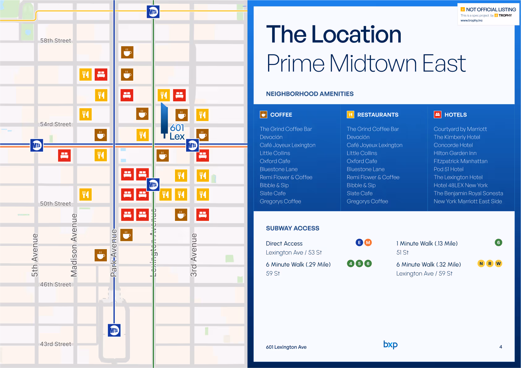 This design was inspired by the skyscrapers's powerful shape, its aluminum and glass facade and BXP's signature blue. The copywriting highlights the suite's strengths: Iconic, renovated building. Full skyline floor and high-end building and neighborhood amenities.